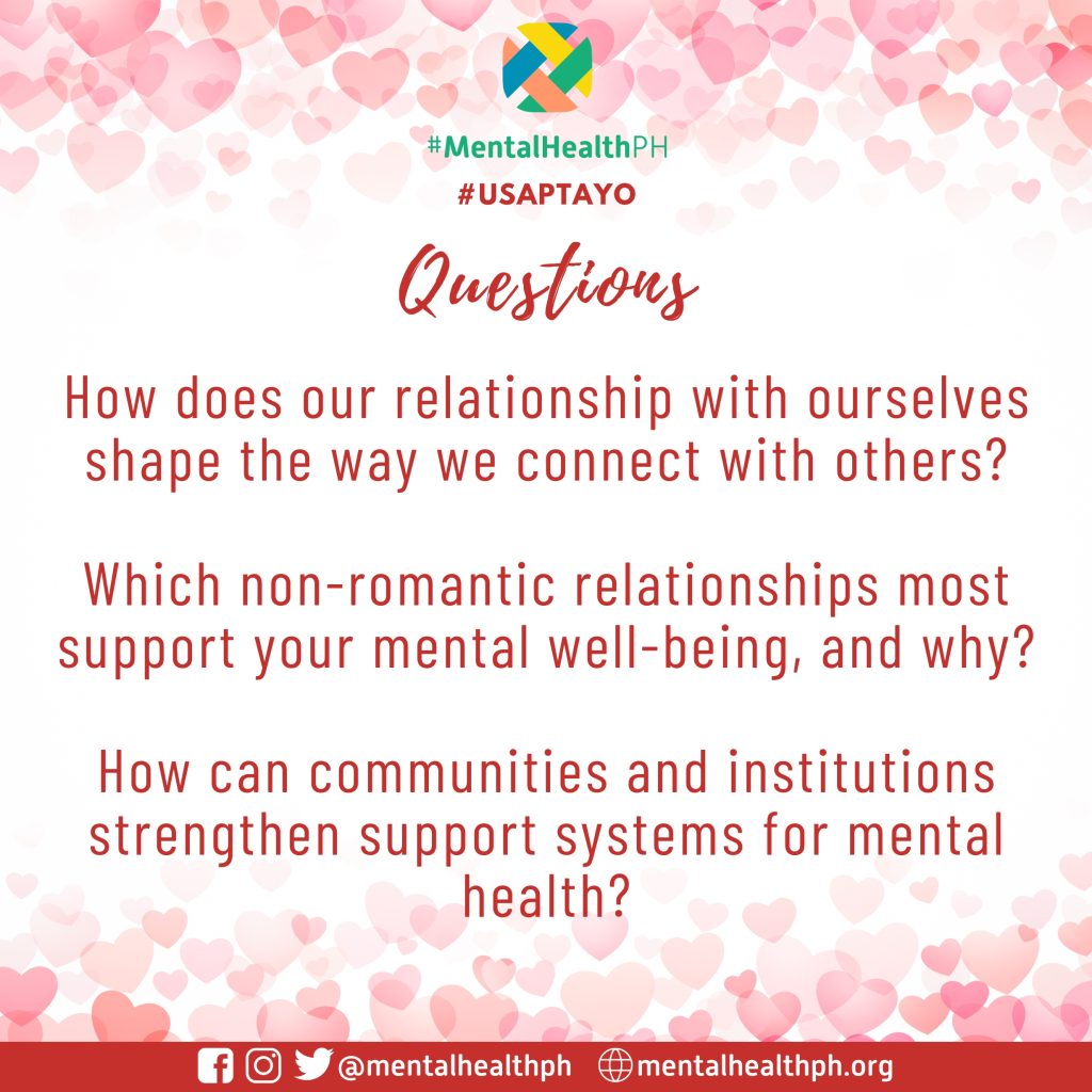 February is often framed around romantic love, but for mental health and well-being, relationships extend far beyond romance. For #UsapTayo, we shift the conversation toward a more inclusive and sustaining view of connection—one that recognizes the importance of our relationship with self, as well as with friends, family, and broader support systems.